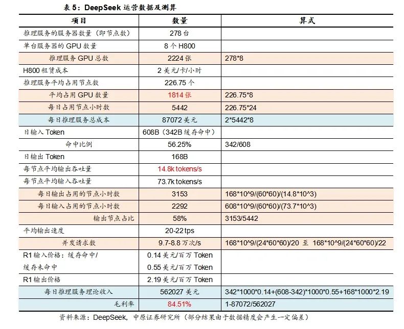 根据DeepSeek在3月1日发布的《DeepSeek-V3 / R1 推理系统概览》中“线上系统的实际统计数据”的相关数据,我们对DeepSeek的实际推理成本做了进一步的测算。
