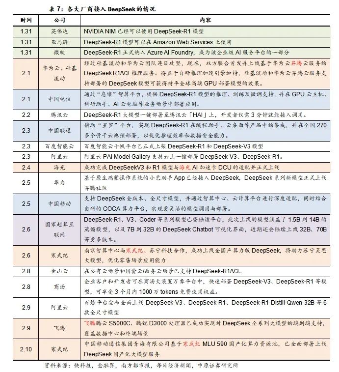 在Deep-R1和DeepSeek-V3发布以后,海内外云厂商都快速接入了DeepSeek的模型并提供MaaS服务,省去了开发者买卡、装驱动、配网络、配存储、装环境、装框架、下载模型等繁琐步骤。同时,包括昇腾、昆仑芯、寒武纪、飞腾、海光在内的国产芯片也都对DeepSeek进行了适配,加速了国产替代进程。下游的软件厂商也都快速接入了DeepSeek,加速了在大模型的应用落地,也可以很好地满足更多私有化的行业需求。