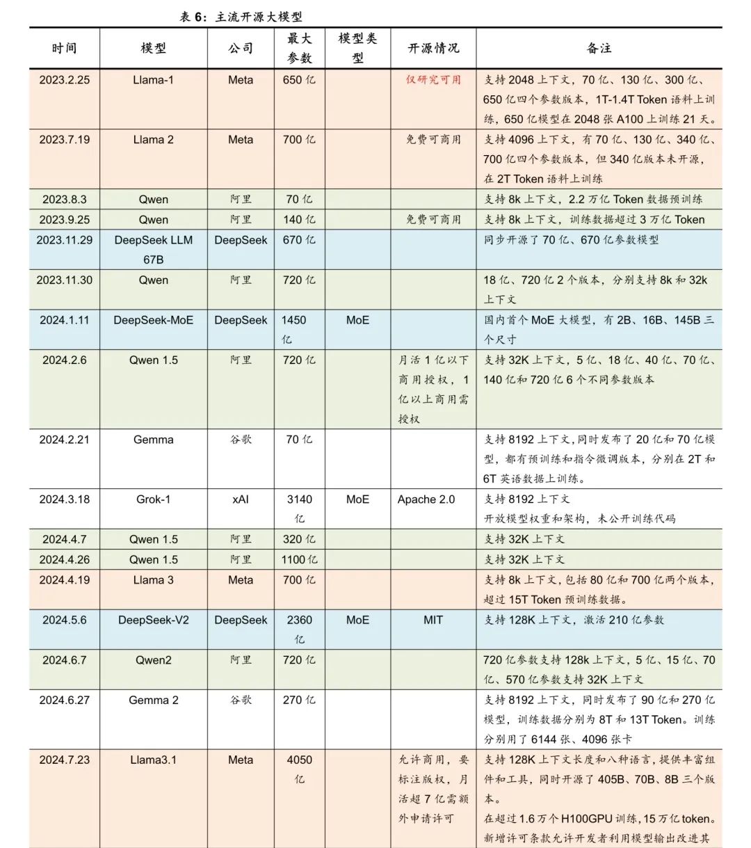 Meta:作为此前开源大模型领域的标杆,Meta开源了Llama 1、Llama 2、Llama 3、Llama3.1系列模型,同时在模型能力上比肩GPT-4o,包含模型最大参数达到了4050亿。