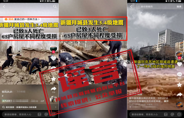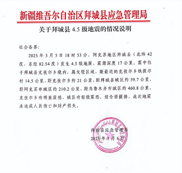 3月6日,拜城县应急管理局发布辟谣声明:经全面摸排,此次地震未造成人员伤亡和财产损失。