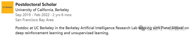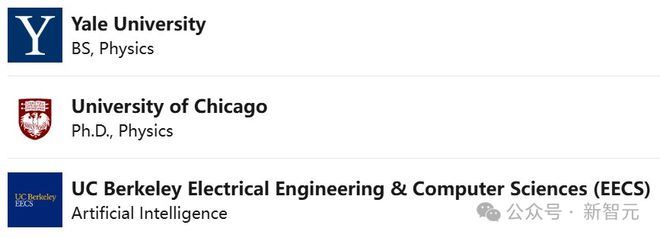 此前,他在耶鲁大学获得学士学位,在芝加哥大学获得理论物理学博士学位,并在加州大学伯克利分校BAIR实验室进行AI领域的博士后研究,主攻深度强化学习和无监督学习。