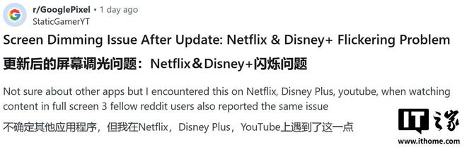 IT之家 3 月 8 日消息,科技媒体 Android Authority 今天(3 月 8 日)发布博文,报道称多名 Pixel 用户反馈,在安装 3 月更新之后,观看 Netflix、Disney Plus 或 YouTube 全屏视频时,屏幕亮度出现异常波动。