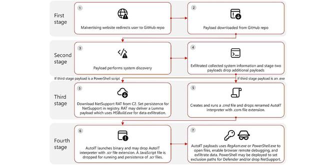此次攻击活动被命名为“Storm-0408”,涉及多个与远程访问或信息窃取恶意软件相关的威胁行为者,他们通过钓鱼、搜索引擎优化(SEO)或恶意广告活动分发恶意载荷。