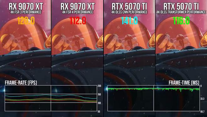 在静止或低速物体细节处理上,FSR 4优于NVIDIA的旧版CNN模型。然而,与NVIDIA DLSS 4的全新Transformer模型相比,FSR 4在细节处理上仍显不足。在运动物体处理上,FSR 4与CNN模型表现相当,这对于RX 9000系列GPU用户来说是一个令人满意的结果。