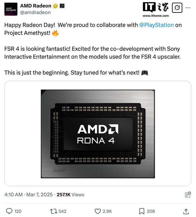 IT之家 3 月 8 日消息,AMD Radeon X平台官方账号发文,透露FSR 4技术系 AMD与索尼PlayStation合作开发而成,隶属“Project Amethyst(紫水晶计划)”,AMD同时表示其正与索尼“致力后续内容研发”。