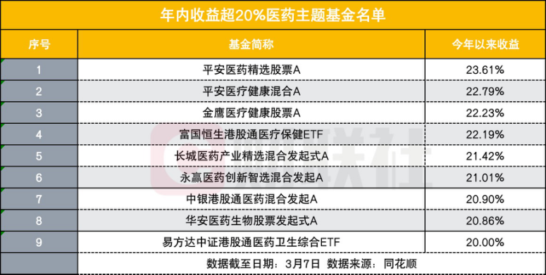 同花顺数据显示,截至3月6日,共有平安医药精选股票A、平安医疗健康混合A、金鹰医疗健康股票A、富国恒生港股通医疗保健ETF等9只基金的今年以来收益超20%。其中,平安医药精选股票A年内收益高达23.61%。