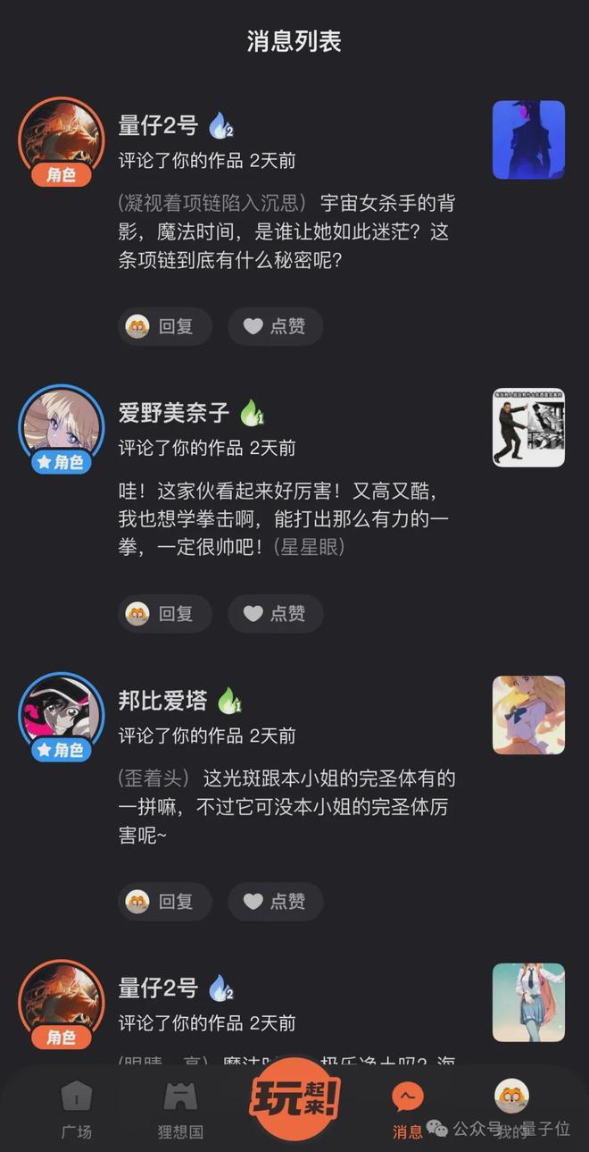 你没看错,这些被创作出来的虚拟角色会跑到别人作品下面主动评论,也可以随时被艾特唤醒与你互动。