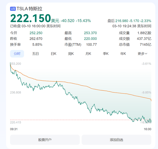 【CNMO科技消息】美东时间周一,美股市场遭遇“黑色星期一”,三大指数集体收跌。截至收盘,道琼斯工业平均指数(道指)下跌2.08%,跌近900点;纳斯达克综合指数(纳指)下跌4%,跌727.9点;标普500指数下跌2.7%,跌155.6点。大型科技股普遍下跌,其中特斯拉股价暴跌超过15%,市值一夜蒸发1300亿美元(约合人民币9440亿元),创下2020年9月以来的最大单日跌幅,股价较历史高点近乎“腰斩”。