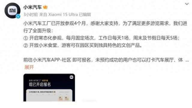小米汽车官方表示,常态化参观将于每月固定场次,工作日每天 1 场,周末及节假日每天 5 场。还会开放小米食堂。