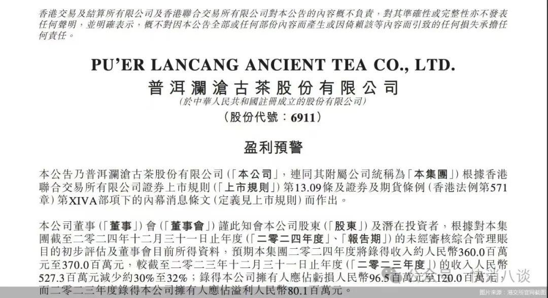 2025年3月10日,澜沧古茶发布盈利预警,预计实现收入为3.6亿—3.7亿元,同比下降约30%—32%;公司拥有人应占亏损约9650万元—1.2亿元,上年同期为溢利8010万元,同比由盈转亏。