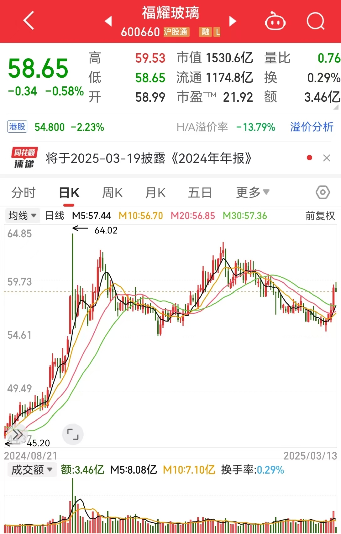 截至3月13日午盘,福耀玻璃(SH600660)股价报58.65元/股,总市值为1531亿元。