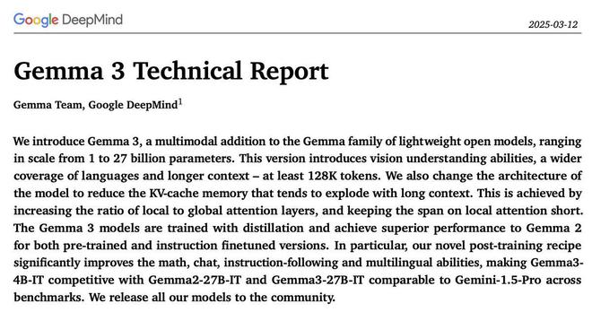 此外,Gemma 3的技术报告已经放出,想要了解该系列模型更多细节的小伙伴可以移步查阅。