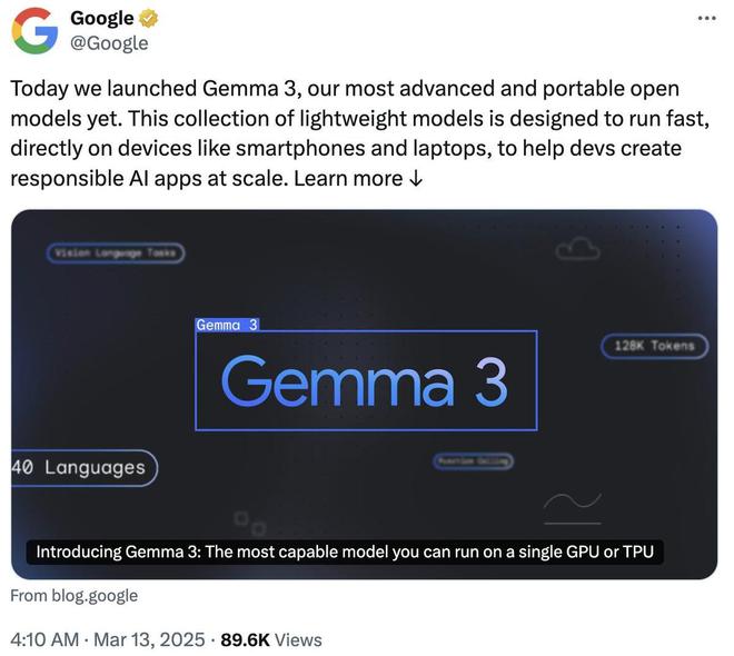 首先是谷歌开源模型家族Gemma的新成员——Gemma 3,它是一系列基于Gemini 2.0的轻量级SOTA开源模型。作为谷歌迄今最先进、最便携且最负责任开发的开源模型,Gemma 3专为多种设备设计,从手机、笔记本电脑到工作站,都能实现高速运行,帮助开发者在需要的任何地方创建AI应用。
