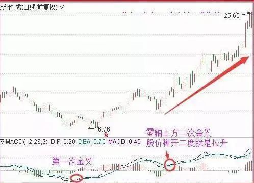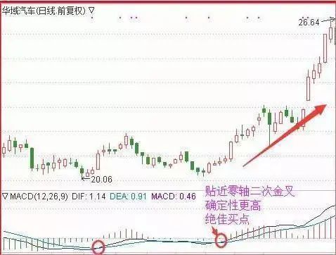 要点:二次金叉必须在零轴之上或十分靠近零轴!MACD的两条黄白线,站上零轴后回落而不破零轴,或者在零轴附近,再次金叉,是一轮加速大行情的买点!第一次金叉后,股价小幅反弹,MACD站上零轴;随后股价回踩,MACD也死叉回落,但没有跌破零轴;随后股价企稳,MACD在零轴上方二次金叉,股价也再次打开上涨空间!