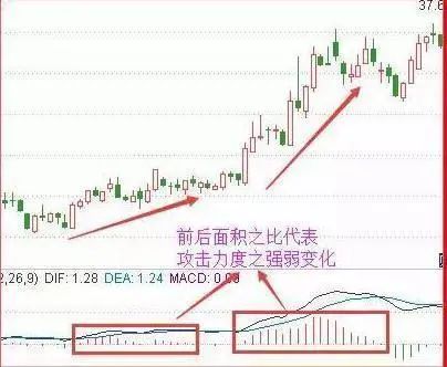 既然是两段走势的对比,自然就会过渡到其中红绿柱(代表买卖动能)的比较!而红绿柱与零轴围城的面积之比,就是最精准的研判方法!