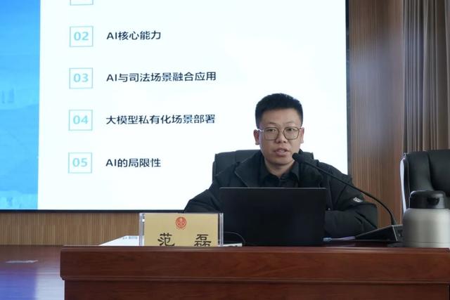范磊围绕人工智能在审判执行工作中的应用进行了深入讲解和演示。系统阐述了人工智能的发展简介、核心能力,搭建了关于人工智能的知识框架。结合案件实体卷宗材料,现场智能抽取案件事实,梳理案情脉络,快速审理案件,自动化生成裁判文书,生动展示了人工智能系统的功能和优势,引导与会人员将人工智能与审判执行工作深入融合。