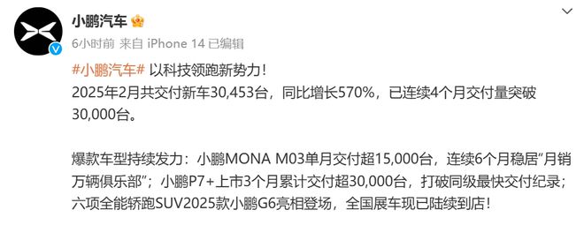 据公司微博,2025年2月,小鹏汽车共交付新车30453台,同比增长570%。小鹏汽车已连续4个月交付量突破30000台。