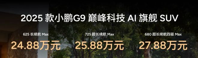 2025 款小鹏 G9 定位为「巅峰科技 AI 旗舰SUV」,提供了 625 长续航 Max、725 超长续航 Max、680 超长续航四驱 Max 三个版本。