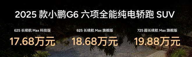 2025 款小鹏 G6 提供了 625 长续航 MAX 科技版/旗舰版、725 超长续航 MAX 旗舰版三个版本。