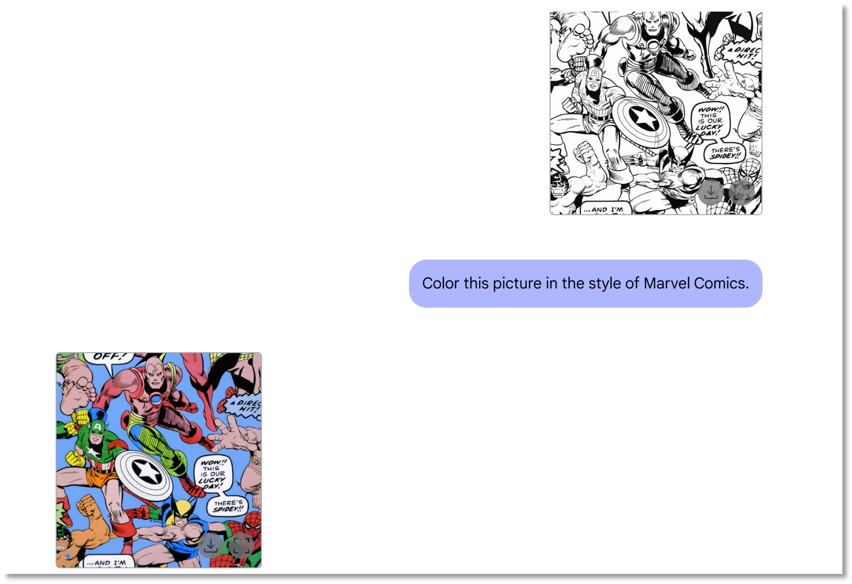 记者随后发送了一张黑白漫画,并要求模型为该图片上色,且色彩风格需契合漫威的风格。