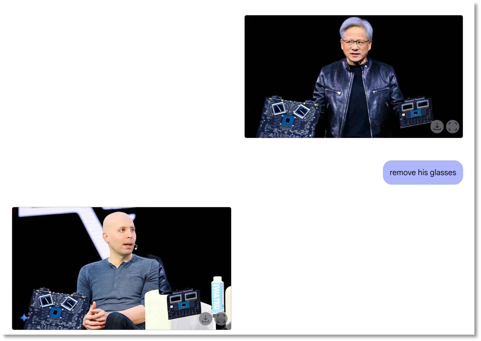 然而,Gemini 2.0 Flash在运行过程中也出现了一些状况。当记者在同一对话页面继续与模型交互,提出“去掉黄仁勋眼镜”的指令时,Gemini 2.0 Flash给出的回应并非如预期那样。其回传的图片中,主体变成了刚刚生成过的奥尔特曼形象,同时还融入了记者发送的黄仁勋图片中的英伟达芯片元素。
