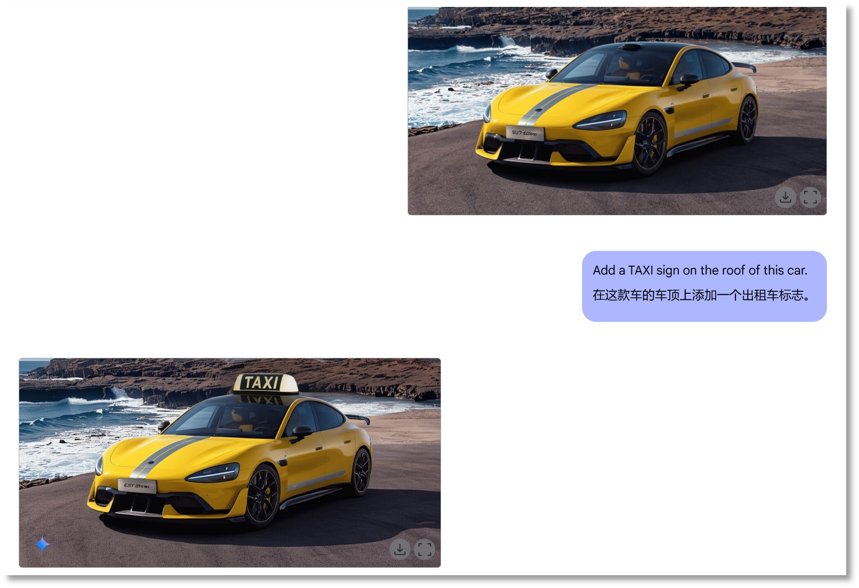 随后,记者又向Gemini 2.0 Flash发送了一张电车的图片,并提出在车顶上添加“TAXI”标志的指令。经Gemini 2.0 Flash处理后回传的图片,“TAXI”标志与电车整体融合度极高,几乎难以察觉到后期添加的痕迹。