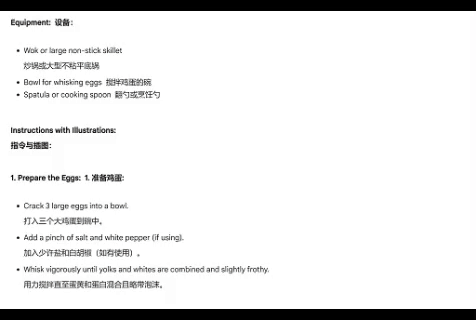 Gemini 2.0 Flash还具备一项技能——生成图文并茂的菜谱。为测试其实际表现,记者以“番茄炒蛋”这道家常菜为例,要求模型生成一份包含详细步骤的图文菜谱。