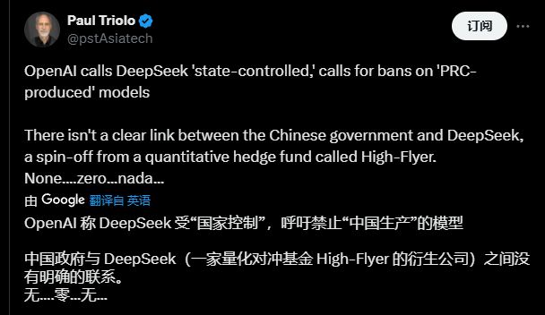 OpenAI 称, “DeepSeek 同时受到国家补贴、国家控制和免费提供,其用户付出的代价是隐私和安全。 ”