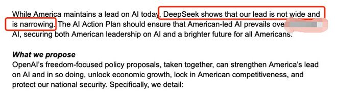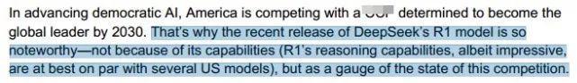 更有意思的是, OpenAI 居然在报告里还在暗戳戳嘴硬: “DeepSeek 的 R1 模型如此值得注意,不是因为它的能力( R1 的推理能力,尽管令人印象深刻,但充其量与美国的几个模型相当 ) ”