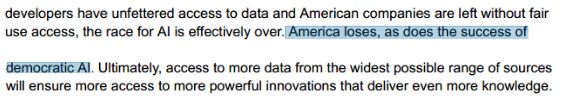最幽默的是, OpenAI 还在报告里威胁说, “ 美国失败了,民主人工智能的成功之路也将终结。最终,确保更广泛的数据来源才能带来更强大的创新,并提供更多的知识。 ” 这下看懂了,原来搁这儿等着呢。