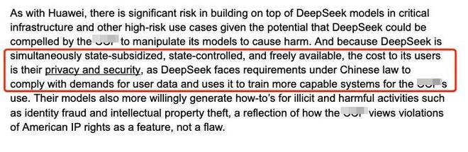 他们的理由也很简单粗暴:就因为 DeepSeek 是中国生产的,很不安全,必须禁止!