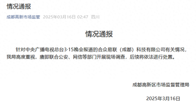 针对中央广播电视总台3·15晚会报道的合众易联(成都)科技有限公司有关情况,我局高度重视,赓即联合公安、网信等部门开展现场调查,后续将依法进行处置。