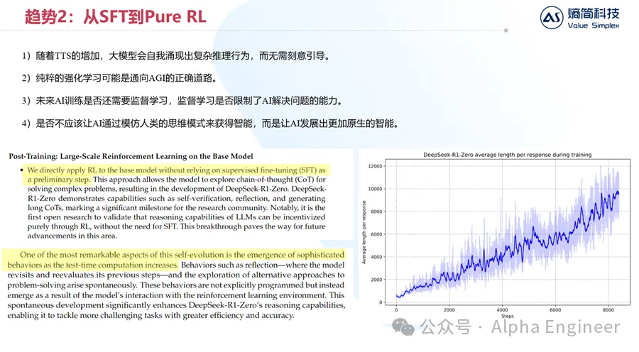 如下边右图所示,横轴是大模型RL的迭代步数,纵轴是单次问答的token长度。我们可以看到,随着大模型RL步数的增加,大模型会自主的从“快思考”变成“慢思考”,从最开始每次回答100个token,到最后每次回答接近10000个token。