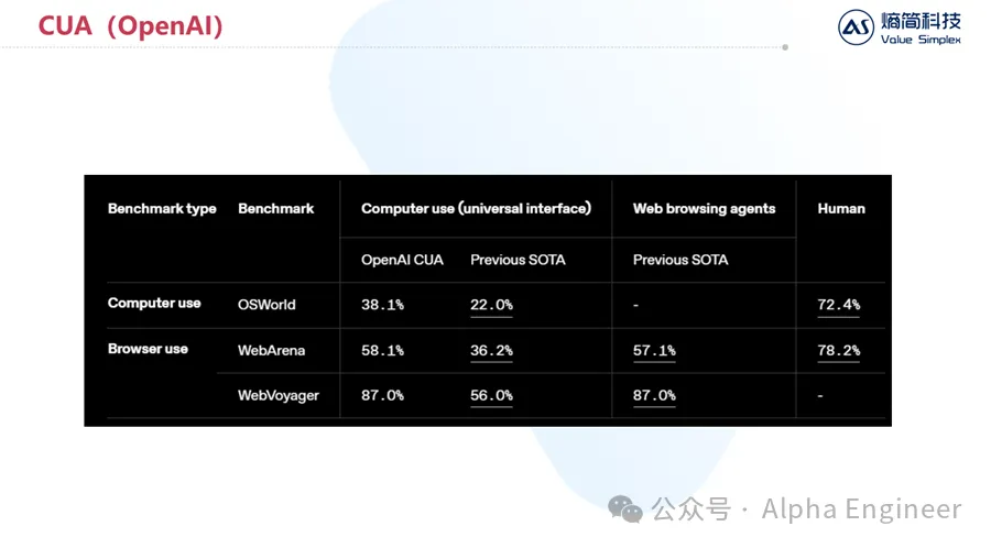 根据OpenAI的官方测评,CUA在操作电脑和操作浏览器这两个场景上,相比上一代SOTA都有了巨大的性能提升。
