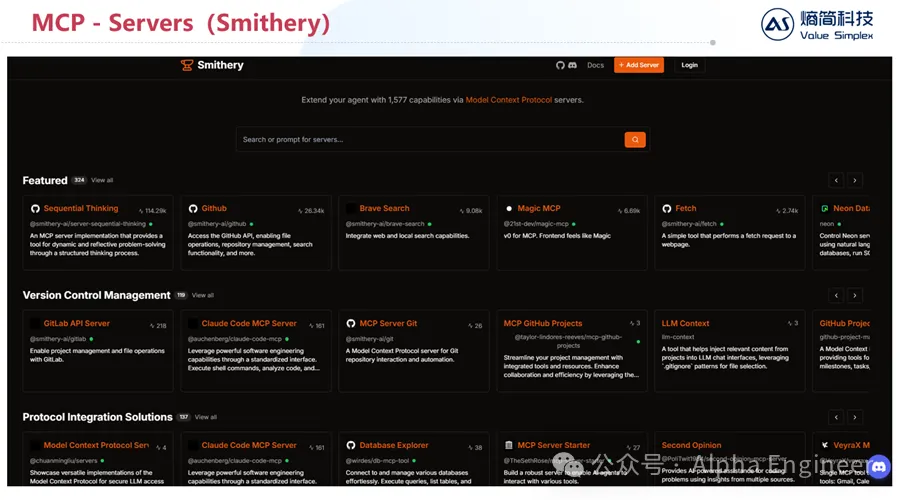 在Smithery平台上你可以轻松查找不同功能对应的工具及服务。随着越来越多的Server接入MCP协议,未来AI能够直接调用的工具将呈现指数级增长,这能从根源上打开Agent能力的天花板。