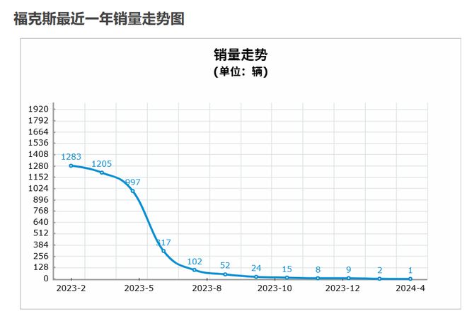 因为在 2023 年的时候,拿中国市场来说,福克斯的月销量就已经掉到了个位数。是的,你没有看错,一个月只卖几台。。。能撑到今年已经够可以了。