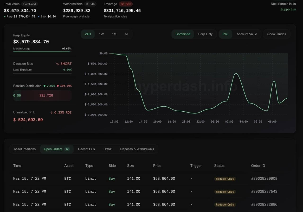 不过,当前他的处境仍称得上相当危险。由于40倍杠杆的极高风险特性,一些市场观察者预计,仅2.5%的价格波动就可能导致整个仓位被清算。