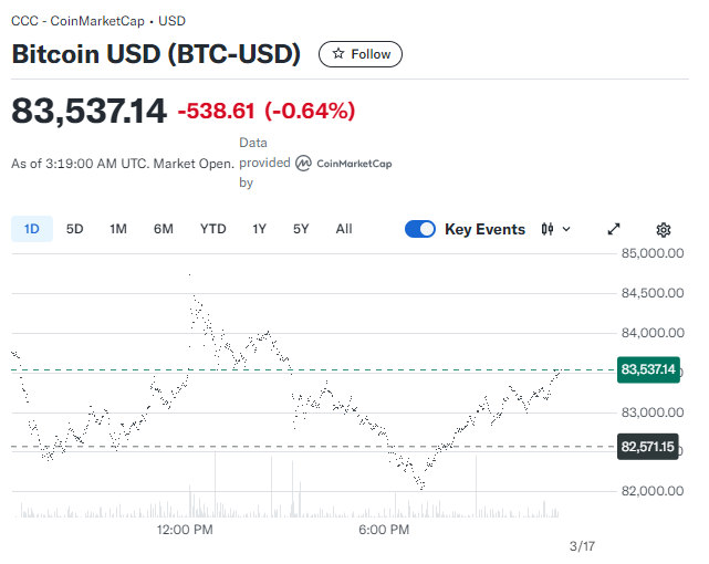 截至发稿,比特币交易价格为83537美元,较上周约下跌2.8%。