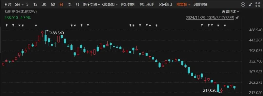 北京时间3月18日,特斯拉美股收盘股价报238.010美元,股价下跌4.79%,市值跌落至7656亿美元。