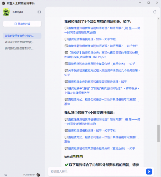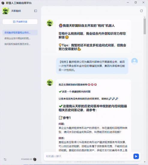 天职国际依托其税务专业技术部门多年积累的丰富税务专业实务案例库,结合国家税务总局及各省市税务机关等监管机构的权威口径,运用大模型的深度分析能力,成功开发了“天职税问”智能问答工具。“天职税问”不仅为业务人员提供了更专业、更全面、更准确的税务咨询服务,而且全面覆盖了各种复杂的税务场景。通过整合全国各地税务机关的实务做法,“天职税问”能够精准匹配税收政策和法规,为项目组提供极具针对性和权威性的涉税意见,充分提升了税务咨询的整体效率与专业性。