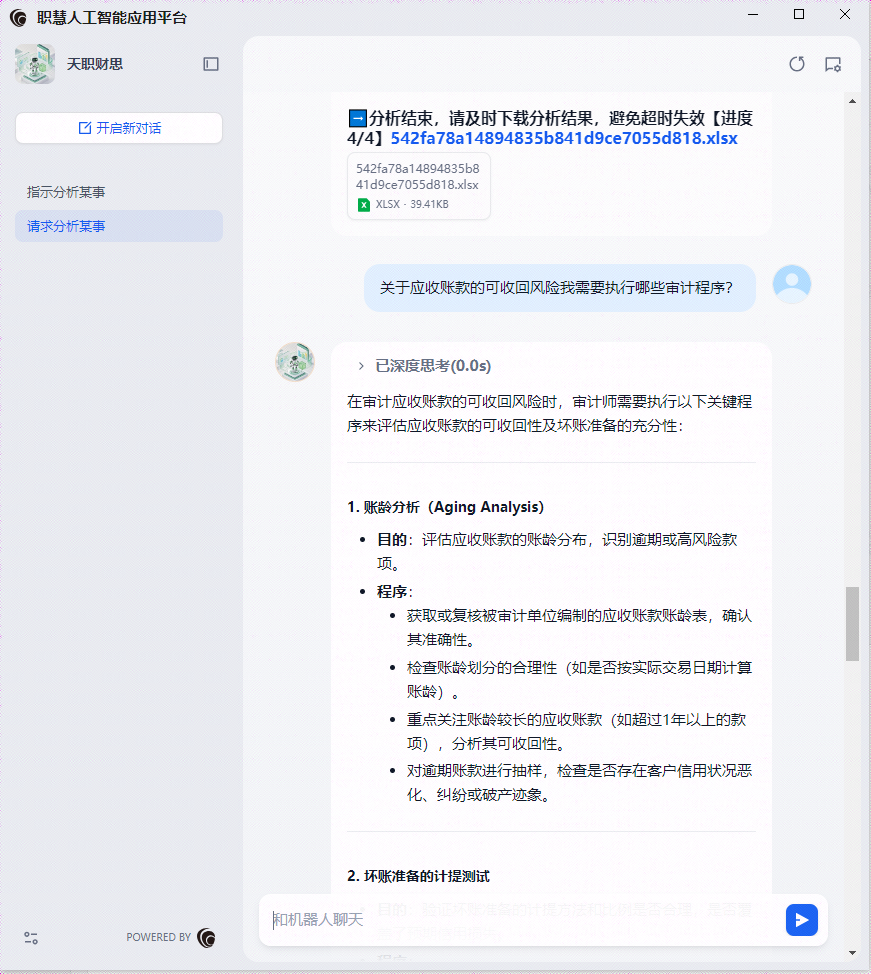 天职国际推出的“天职财思”智能财报分析工具,深度融合审计内在逻辑,辅助业务人员提供了财务报表全科目、多维度的分析支持,并通过内置到模型中的审计程序知识库进行智能变动分析,助力业务人员聚焦于高风险领域的审计应对。智能财报分析工具的核心功能是结合行业数据自动解析财报数据的全科目变动,并通过“金额、比率、趋势”三维自动识别异常信号,精准捕捉潜在错报风险,提示业务人员应实施的应对措施,并一键生成基于财务报表分析结果的进一步审计程序及资料需求。“天职财思”辅助业务人员提升了审计效率与风险应对能力,为天职国际的专业审计服务增添了新的动力。