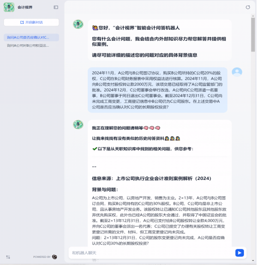 “会计视界”智能问答工具的核心功能亮点是,在立足于天职国际多年来对会计准则问题深度解析的基础上,同时整合了财政部、证监会、交易所等权威机构发布的实施问答和案例解析,通过构建一个全面且动态的会计处理知识库,确保了会计解决方案的合规性和广泛适用性,为业务人员提供了更为便捷、精准、高效的解决方案获取途径,引领会计准则问答向更加智能、高效的方向发展。