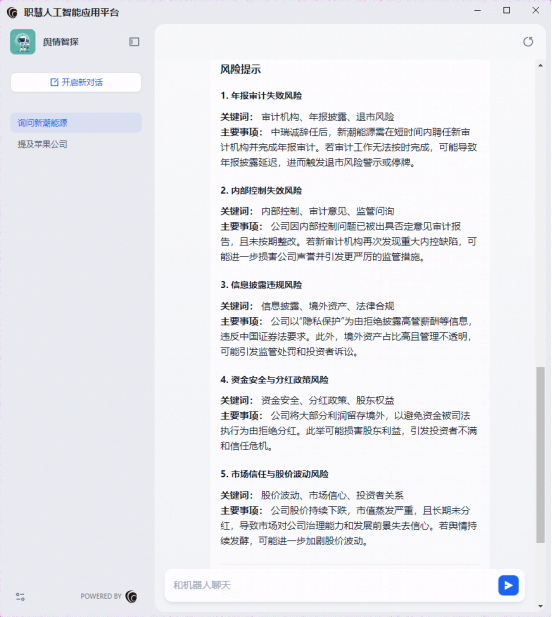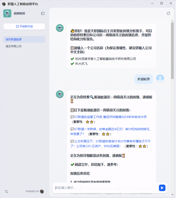 天职国际推出的“舆情智探”智能舆情分析工具,凭借AI技术与标准化处理流程的深度融合,将传统模式下耗时冗长的信息搜索和处理工作,压缩至3分钟内完成,支持业务人员实时掌握服务对象的舆情动态,为项目风险预警和审计应对提供精准的数据支撑。