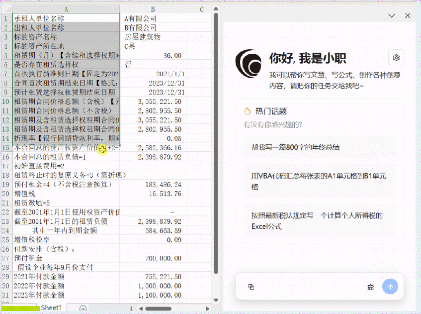 天职国际通过将智能助理“小职”嵌入Office的交互方式,实现了业务人员直接引用表格、文档等底层数据源的功能。“小职”办公助手可以将数据源高效转换为便于人工智能理解的Markdown格式或可自动执行的VBA代码,助力业务人员轻松完成复杂的数据处理与自动化任务,同时还可以根据业务人员的个性化需求,批量处理各类合同、单据,精准提取所需信息,有效节省了业务人员从海量合同或流水核查中耗费的时间和精力,同时显著提高了数据处理的准确性和一致性。