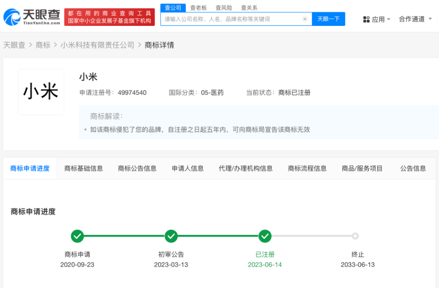 天眼查知识产权信息显示,小米科技有限责任公司此前已取得的“小米”商标中,包含消毒湿巾、救急包、卫生护垫、医用眼罩等商品服务。