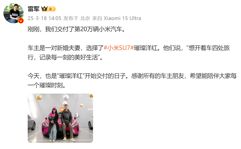 3月18日,小米集团董事长兼CEO雷军在微博发文称,刚刚交付了第20万辆小米汽车。
