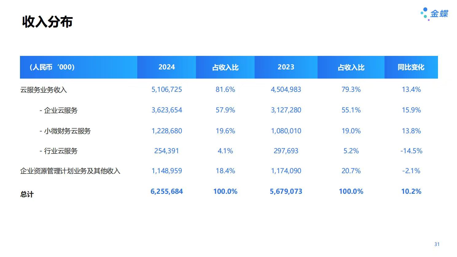 从经营数据来看,2024年金蝶云服务收入达51.07亿元,同比增长13.4%,占总收入比例突破80%。