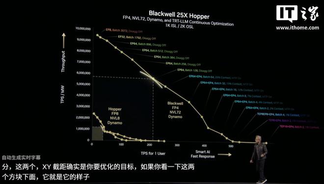 黄仁勋展示了一张关于推理的图表,X 轴显示用户每秒的 Token 数,Y 轴显示工厂每秒的 Token 数。