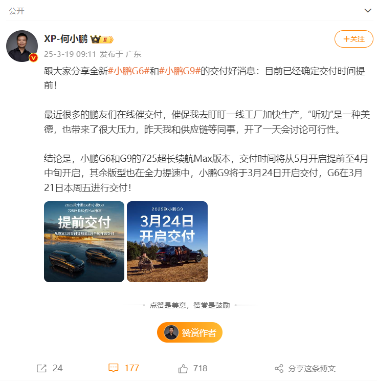3月19日,小鹏汽车董事长何小鹏在微博宣布,全新小鹏G6和小鹏G9目前已经确定交付时间提前。
