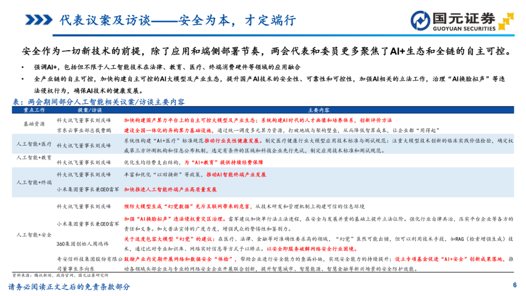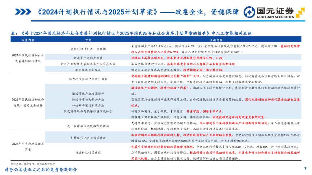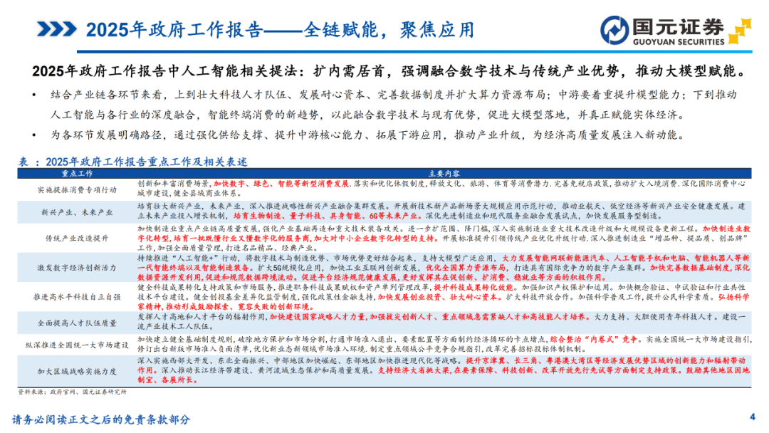本报告摘自国元证券2025年3月20日已发布的《2025年两会专题系列报告之三:人工智能篇——全链赋能 融合加速》查看原文,具体报告及分析内容请详见报告。若因对报告的摘编等产生歧义,应以报告发布当日的完整内容为准。